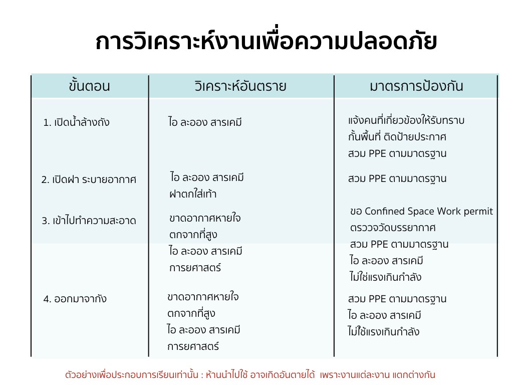 พนักงาน 2 ต้องเข้าไปในถังกรดซัลฟูริก เพื่อเข้าไปล้างทำความสะอาดด้วยน้ำยาทำความสะอาด เราลองมาทำ JSA แบบง่ายๆ เพื่อค้นหาอันตรายกันดูนะครับ
