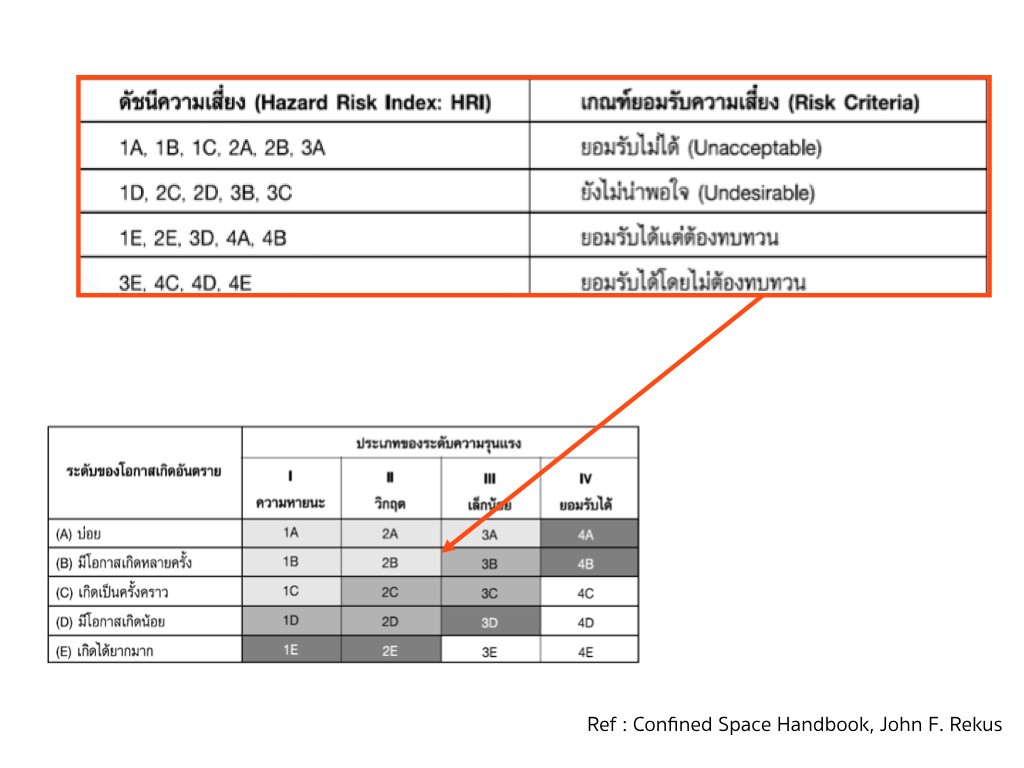 ความเสี่ยงที่ประเมินได้คือ 2B คือ ยอมรับไม่ได้ ดังนั้นก็ต้องหามาตรการป้องกันเพิ่มเติม เพื่อลดความเสี่ยง ให้อยู่ในระดับที่ยอมรับได้ จึงจะอนุญาตให้ทำงานได้